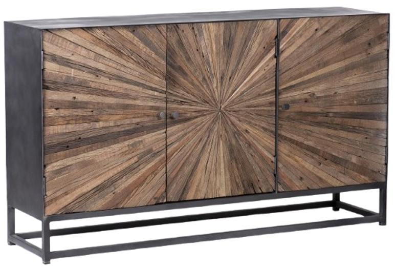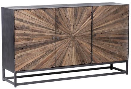 Eye-catching, the dramatic wood starburst pattern on the door fronts are masterfully cut and hand-placed to create an organic and textured look. This piece is balanced out with a grey surround and metal base.Read More